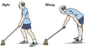 Όταν κάνετε καθαριότητα στο σπίτι (σκούπισμα, σφουγγάρισμα, κλπ) πάντοτε να έχετε τα πόδια σας στο άνοιγμα των ώμων και το ένα λίγο μπροστά από το άλλο. Επίσης να είστε πάντα με το πρόσωπο προς την κατεύθυνση που εργάζεστε. Μην τοποθετείτε το κορμί σας σε στροφή ενώ βάζετε δύναμη.